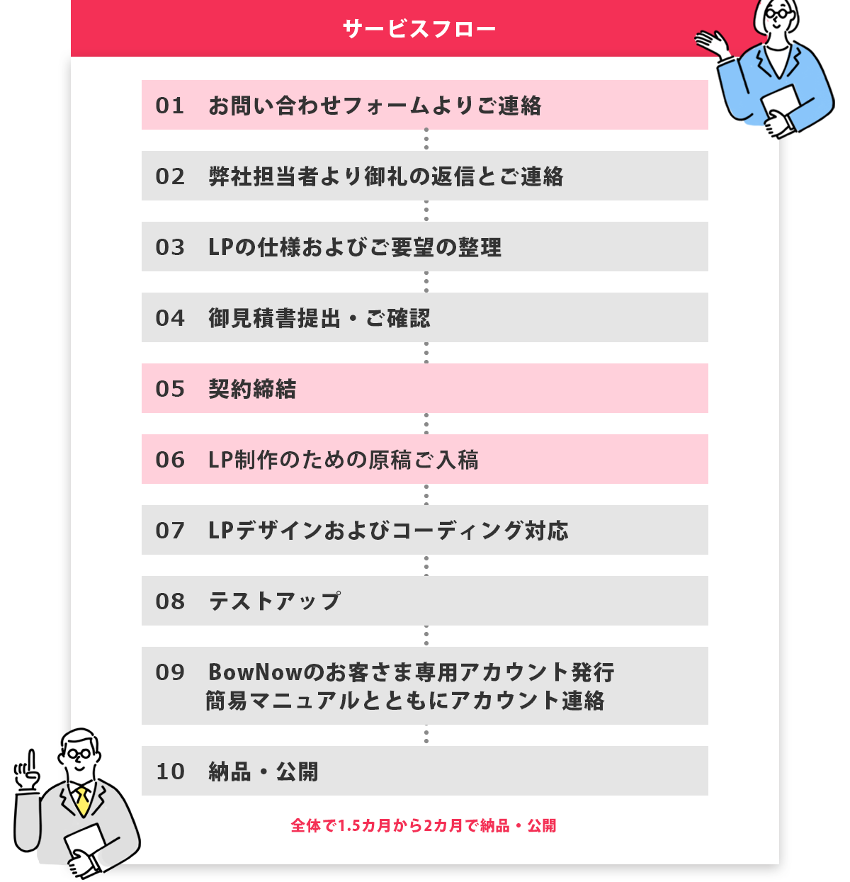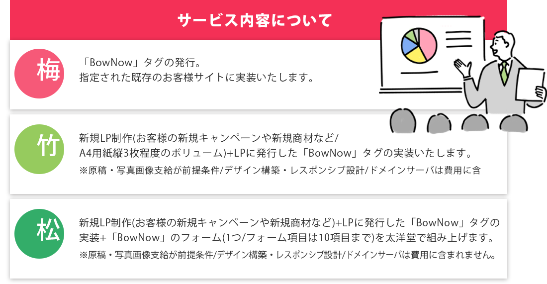 ご入稿いただいた原稿を基に太洋堂で「BowNow」のフォーム(1つ/フォーム項目は10項目まで)組み上げ、完成したフォームのURLをご連絡いたします。